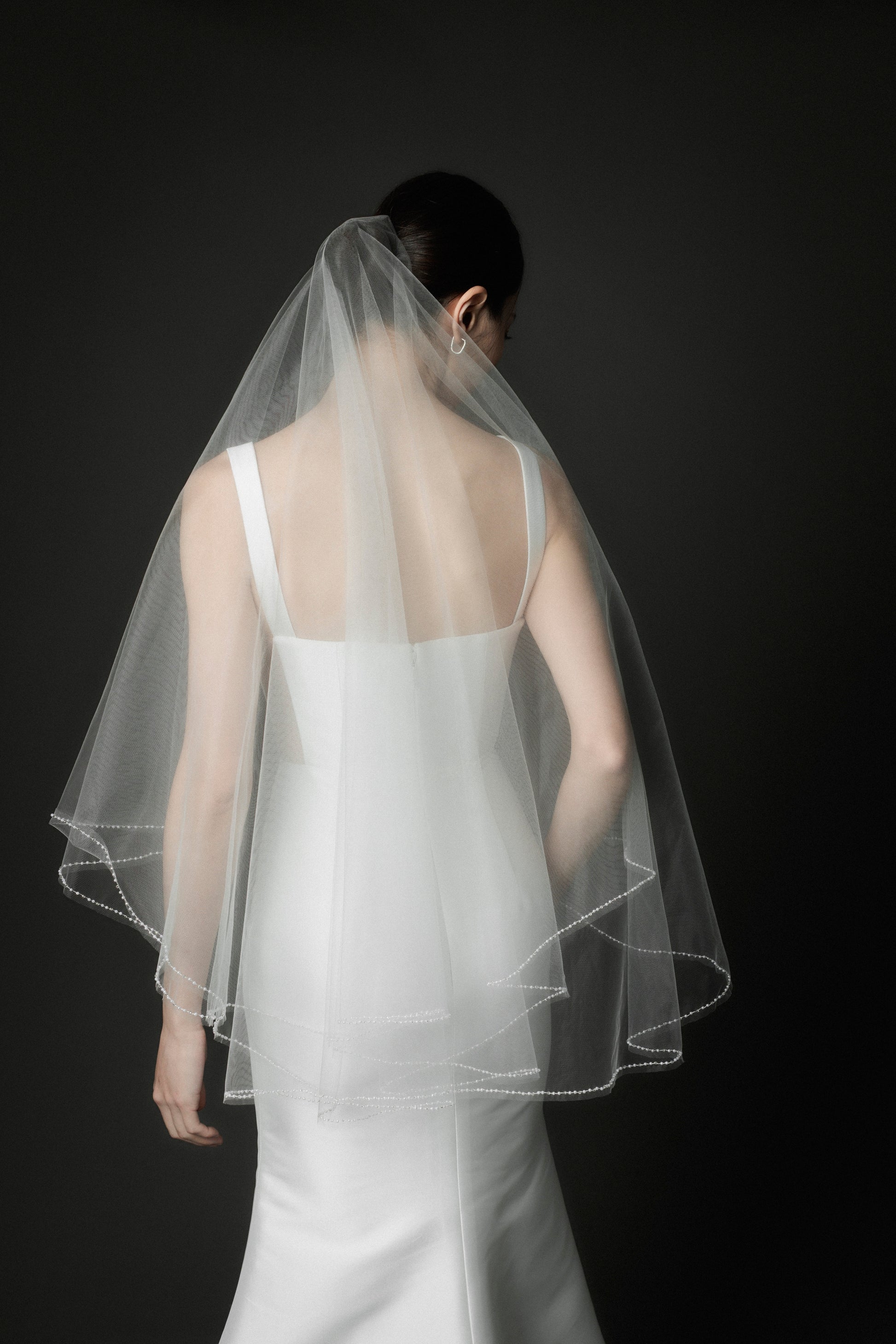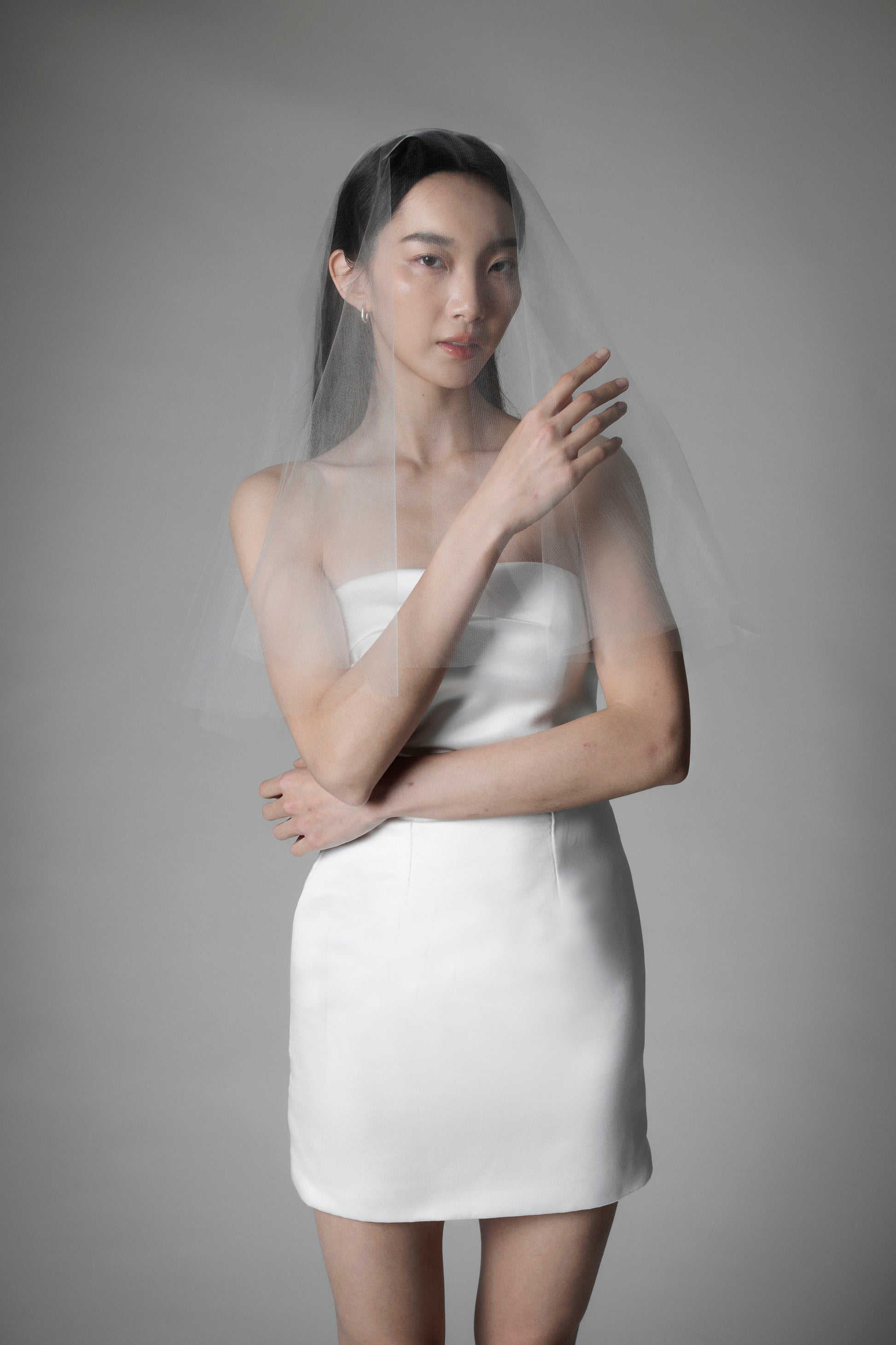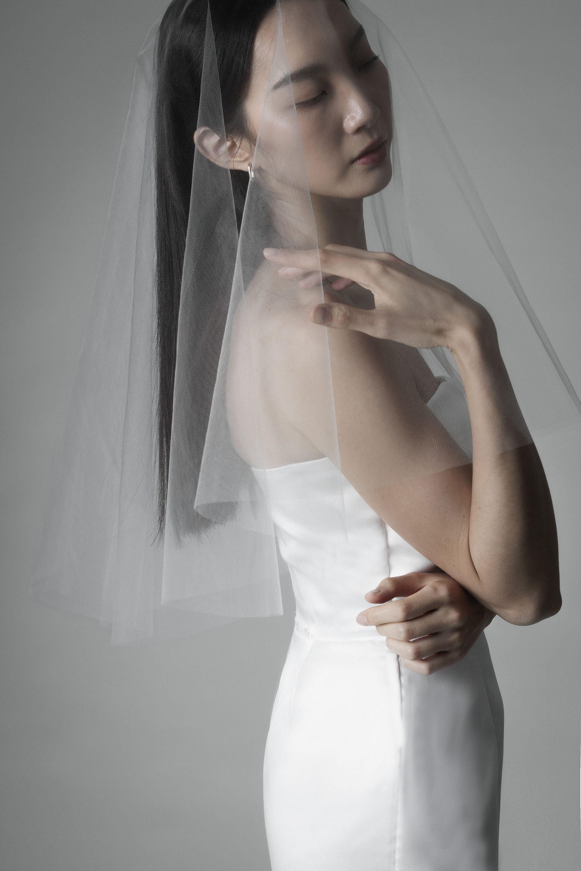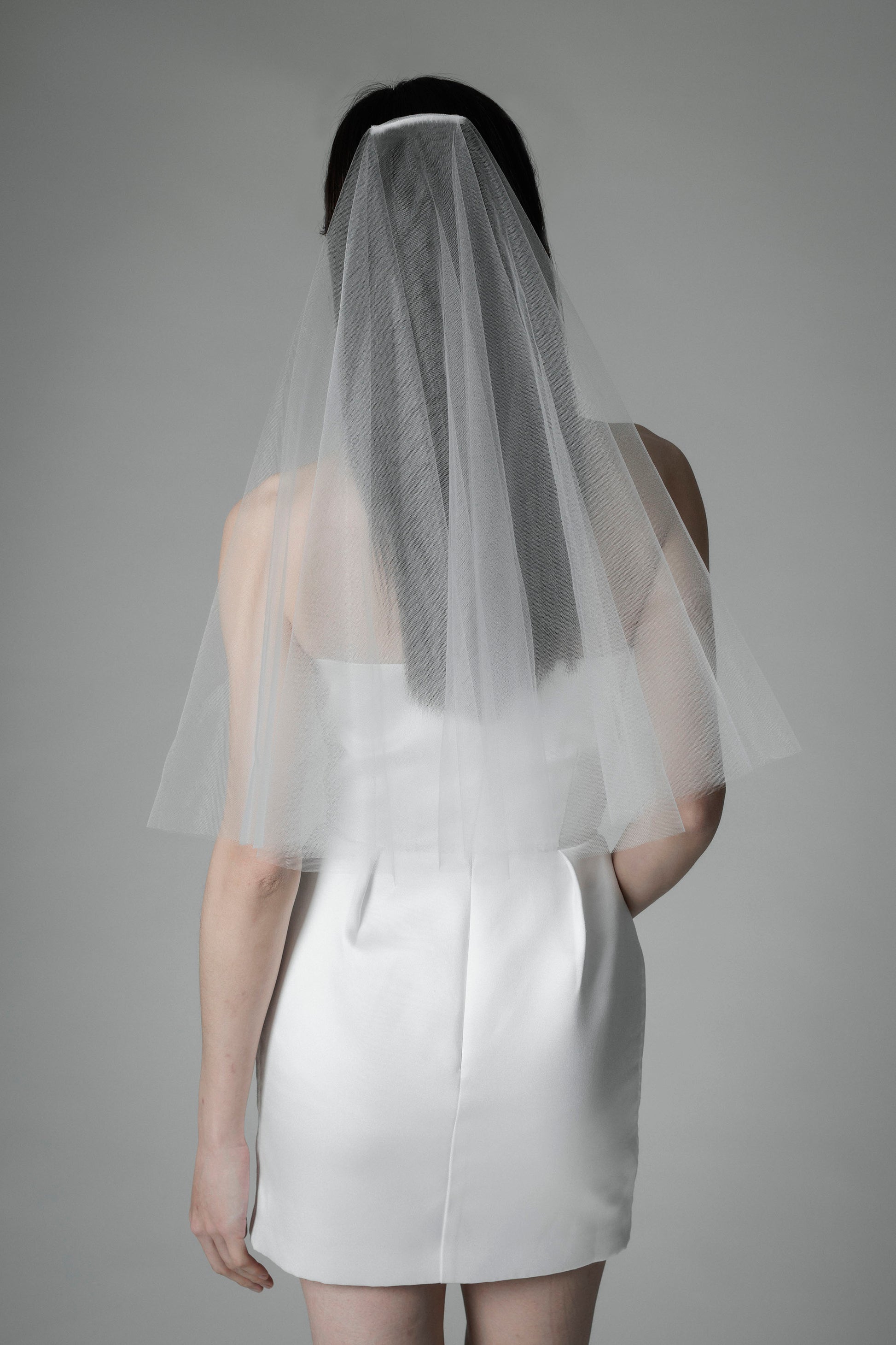 Drop veil is a seamless piece of tulle that delicately drapes over the bride's head, it can be secured in place using hair pins or a hair comb.